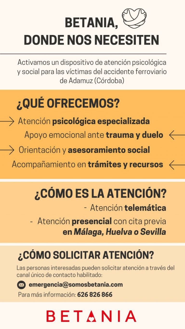 La entidad sin ánimo de lucro estatal Betania ha puesto en marcha un proyecto de atención psicológica y social especializada dirigido a las víctimas y familiares del accidente ferroviario ocurrido en Adamuz (Córdoba). La iniciativa tiene como objetivo dar una respuesta inmediata y continuada al impacto emocional, psicológico y social provocado por el suceso.