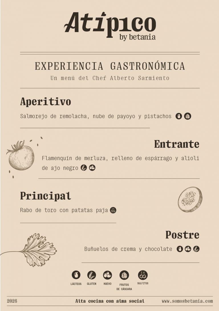 Desde Betania nos complace presentarle el menú de nuestra última iniciativa de Responsabilidad Social Corporativa que estamos desarrollando en nuestra sede: Atípico, un restaurante de alta cocina cuya misión es unir gastronomía y compromiso social.